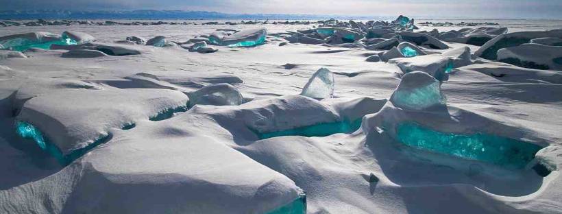 En el invierno, el lago se congela pero el agua es tan clara que se puede ver 40 metros por debajo del hielo. En marzo, las heladas y el sol provocan grietas en la corteza de hielo y aparecen los fragmentos de hielo de color turquesa que vemos en la superficie.